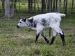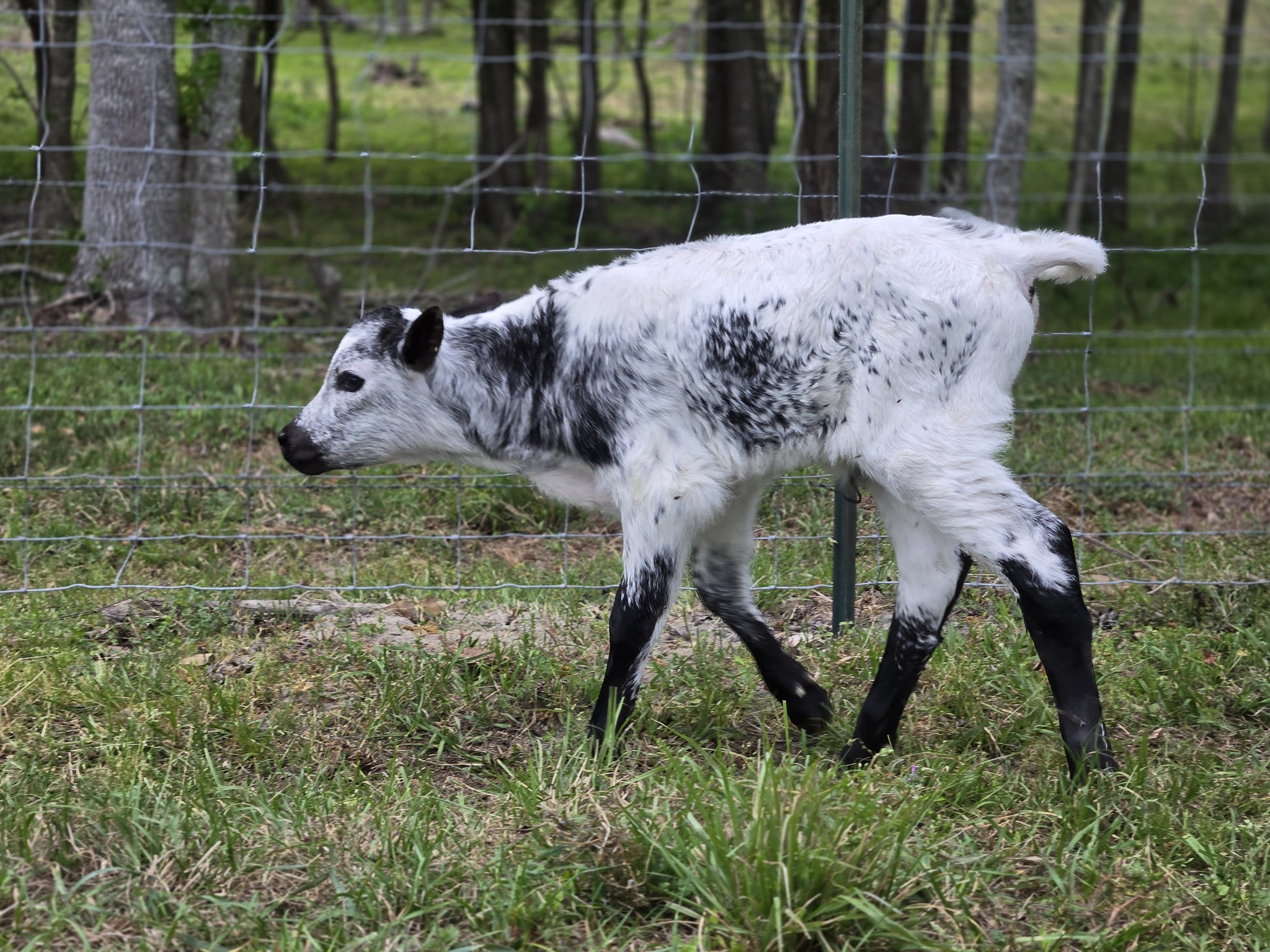 Black and white with dark head and legs.